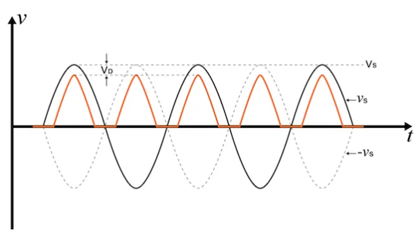 在確定在整流電路中使用哪些二極管時(shí),需要考慮兩件事:1) 二極管處理電流的能力,必須根據(jù)二極管預(yù)期傳導(dǎo)的最大電流進(jìn)行選擇,以及 2 ) 峰值反向電壓 (PIV),即二極管將承受的最高反向電壓;二極管必須能夠承受 PIV。看圖1.2(A),我們可以觀察到,當(dāng)電壓 v S 為負(fù)時(shí),二極管將被截止,電壓 v O為零,導(dǎo)致二極管兩端的反向電壓為v S . 因此,PIV 是v S的峰值: